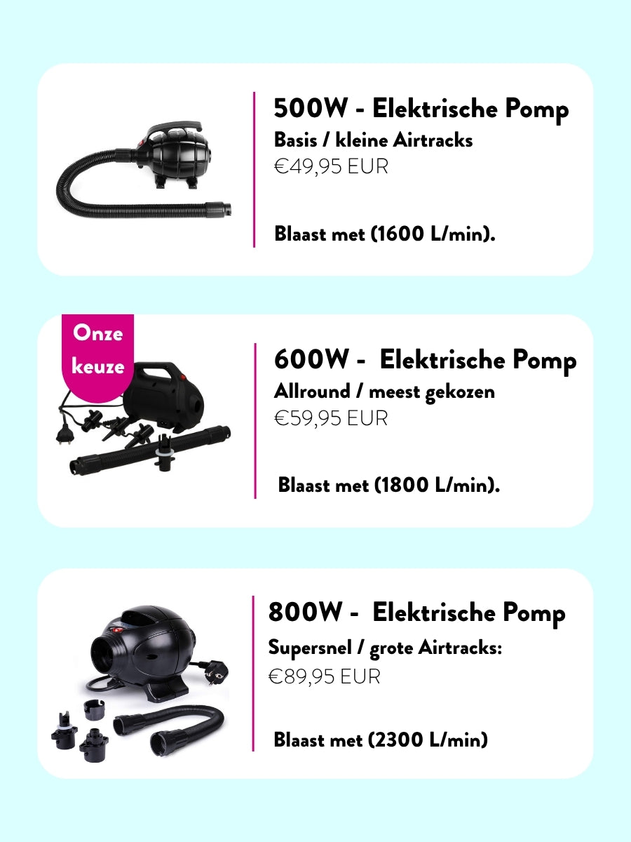 Het kiezen van de juiste pomp hangt af van hoe vaak je je Airtrack gebruikt, welk formaat je hebt en waar je traint. Hieronder leggen we uit wat de verschillen zijn van de pompen.